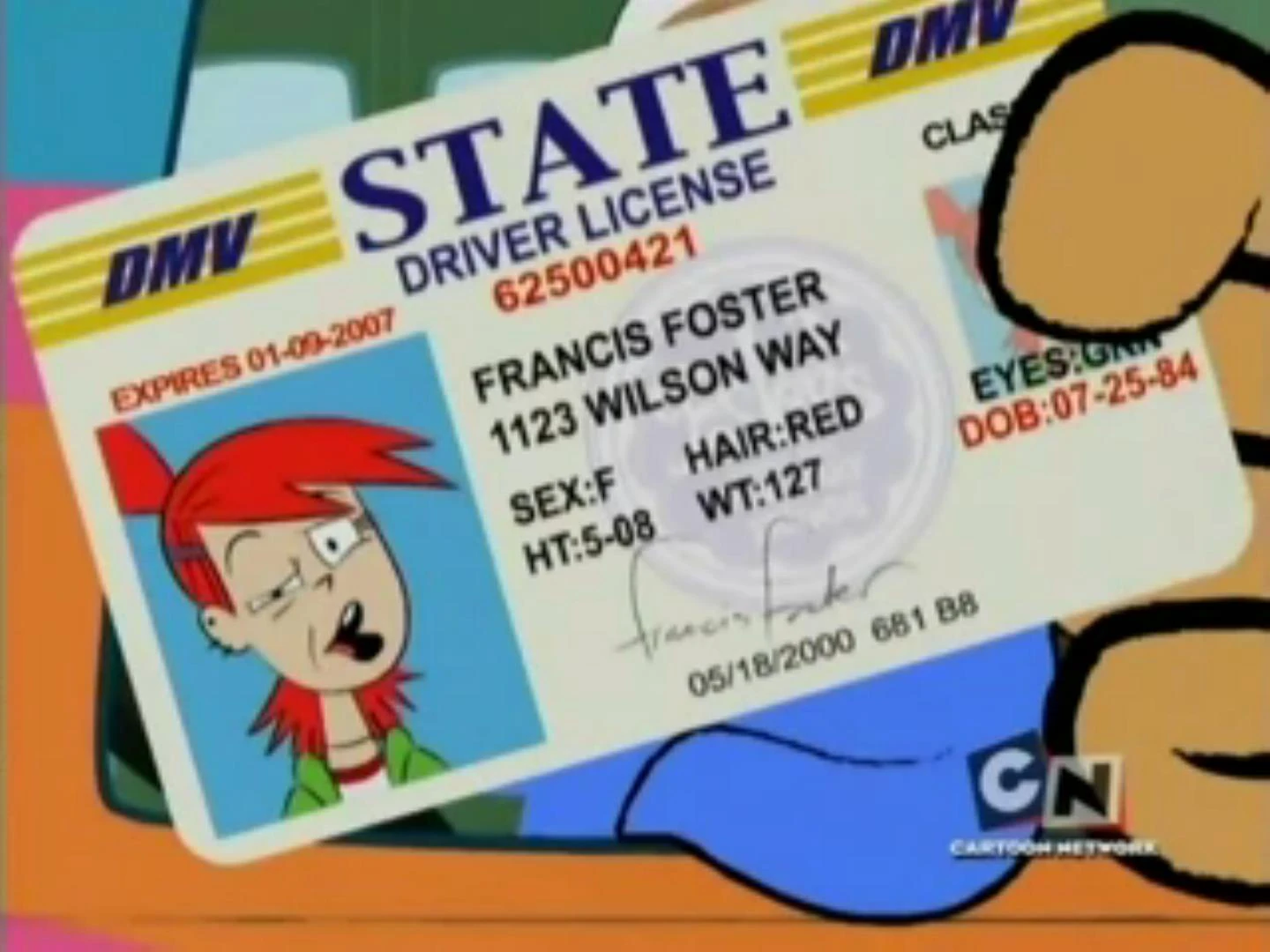 Frankie Foster is based on creator's Craig McCracken's wife Lauren Faust. She is the beautiful, caring, friendly, hard-working, sweet, capable, easygoing but still short-tempered granddaughter of Madame Foster. According to her driver's license, she was born on July 25, 1984, is 5'8" ft tall, and weighs 127 pounds and has green eyes ("Bus the Two of Us" - picture shown below Infobox, and "Destination Imagination" - one of her eyes peeks through a window of the Foster's model). However, in The Trouble With Scribbles, Mr. Herriman said she had let the scribbles out in autumn of 1984 and she appears to be 2-4 years old in the flashback (or at least where she's old enough to talk).